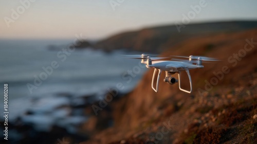 A lone drone hovers over rugged cliffs, serenading the horizon, perfect for World Drone Day or Solitude Saturdays