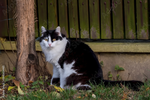 Czarno-biały kot o bursztynowych oczach siedzi przy drzewie, tuż obok zielonego, porośniętego mchem drewnianego płotu. Futro kota jest puszyste, a jego wzrok skierowany jest w stronę aparatu.