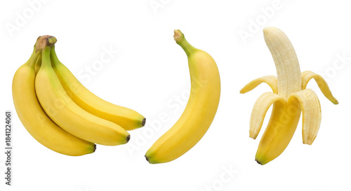 A trio of vibrant yellow bananas with one partially peeled showcasing its creamy flesh isolated on