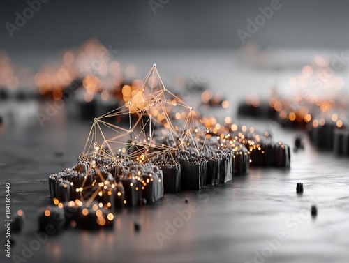 Golden network clusters forming geometric connections across textured dark surfaces, symbolizing data mapping, intelligence emergence, digital growth, and complex systems