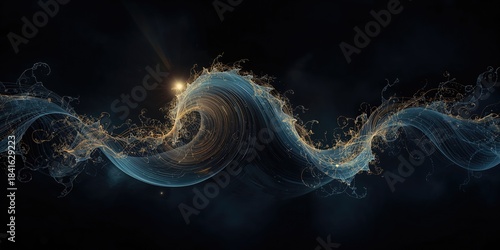 Complex 3-D fractal image of dark-blue ocean wave formations with luminous lines and dynamic color flow, digital rendering