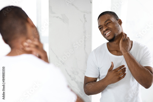 A man in a white t-shirt stands in front of a mirror, showing signs of neck pain while performing his morning routine in a bright bathroom. His expression reflects discomfort and concern.
