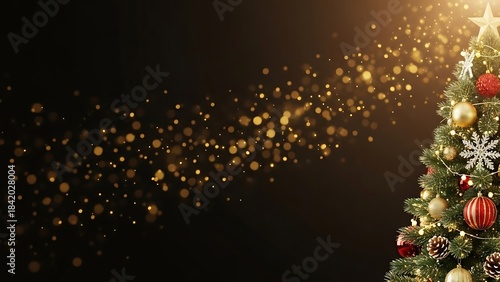 Festive Christmas tree with baubles, ornaments, and blurred bokeh lights