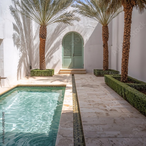 Peaceful turquoise water pool showcased inside traditional house courtyard with calming palm atmosphere exterior design background aesthetic wallpaper 4k