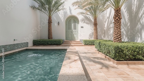 Bright turquoise water swimming pool nestled inside traditional house courtyard with tropical palm shading exterior design background aesthetic wallpaper 4k