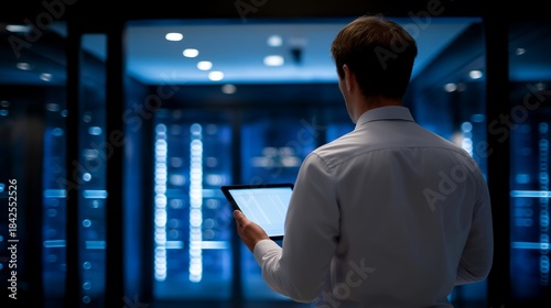 An engineer in a glowing data center reviewing urgent server overload alerts on a tablet while walking between LED-lit racks — mission-critical IT infrastructure management, performance monitoring,