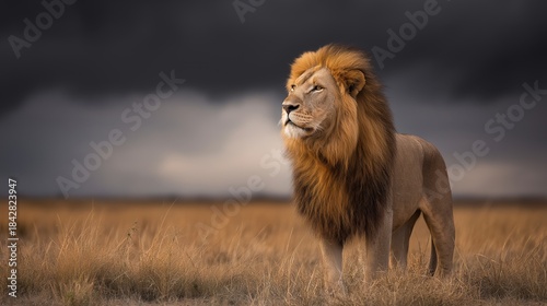 Lion standing in savanna looking into distance under dark sky. Powerful lion representing leadership, strength, and authority in dry grass