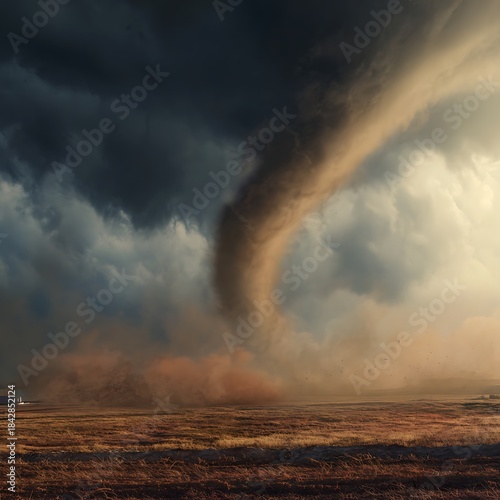 Giant dangerous tornado funnel cloud destroying dry rural field landscape