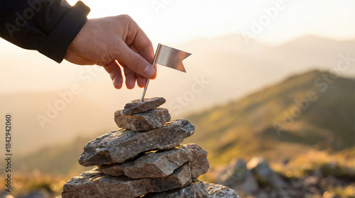 Metaphor of conquering the peak. A human hand marks the reached height with a small flag on balancing stones