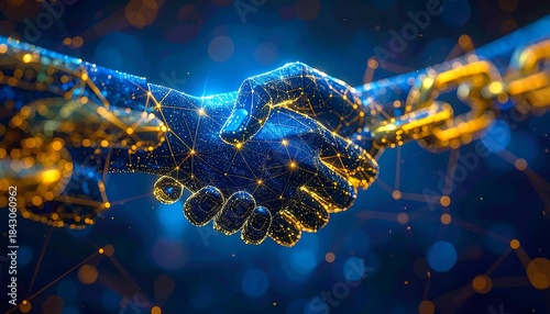A glowing digital handshake with a networked texture, symbolizing secure, connected partnership.