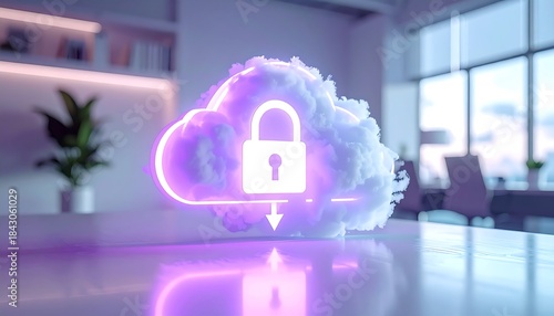 A glowing purple and white holographic cloud with a lock icon and arrow, symbolizing data security.
