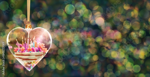 Pocztówka urodzinowa - przezroczysta bombka w kształcie serca z tortem urodzinowym w środku na tle kolorowych rozmyć świateł bokeh