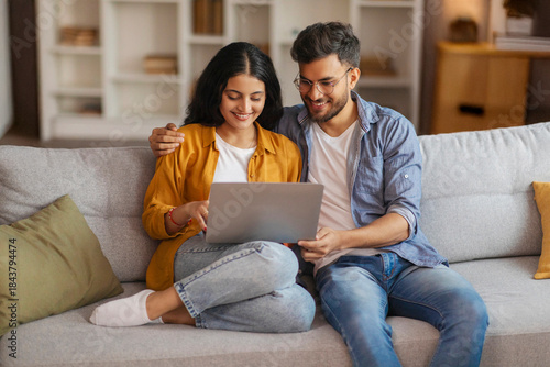 Indian spouses relaxing with laptop on couch, embracing and using computer, browsing internet or shopping online together
