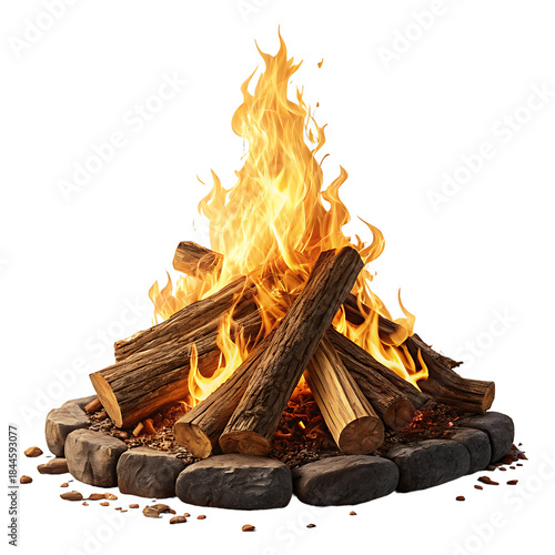 A vibrant and realistic image of a blazing campfire with burning logs and stones on transparent background