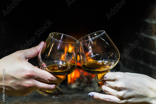people clink glasses in the background of the fireplace