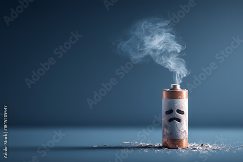Overheated battery with sad face and smoke rising