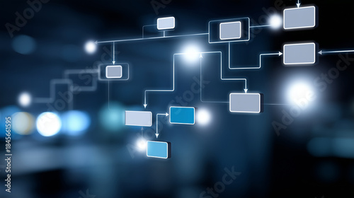 Business process optimization workflow visualization, heavily defocused corporate background, efficiency improvement representation, systematic advancement concept, operational exc