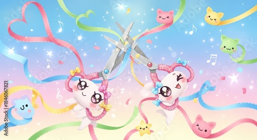 Two cute animated scissors characters interact with colorful ribbons against a pastel sky background