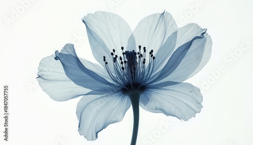 Close up of blue flower bloom with translucent petals. Intricate stamens and pistil visible from below. Soft light highlights delicate botanical structure.