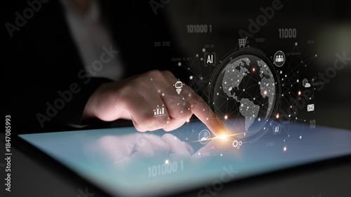 Global AI-powered digital network ecosystem connecting data, finance, analytics, ecommerce, communication, and automation across continents through technology and cloud Latch