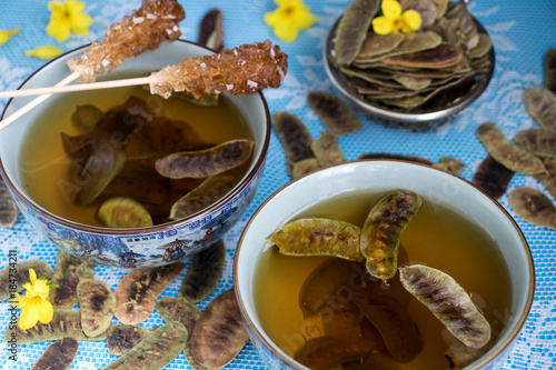 Senna-Tee in Trinkschalen mit Kandiszucker