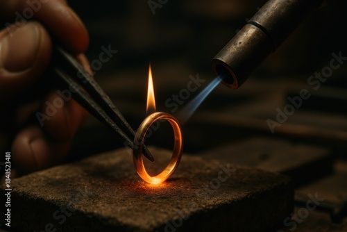 A hot golden ring is held with tweezers and exposed to a flame for soldering, showcasing traditional jewelry crafting technique