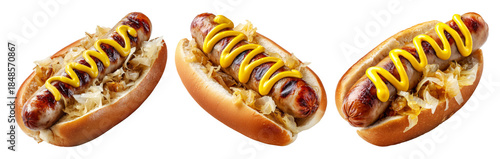 Juicy grilled midwest bratwurst sausage in soft bun with sauerkraut and mustard on top, isolated on white transparent background