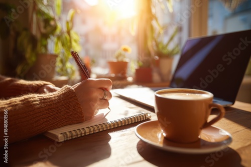Working on a notebook while enjoying coffee in a cozy space during the afternoon
