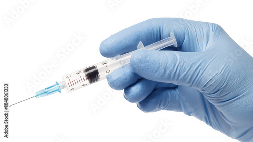 Doctor wearing blue surgical gloves is holding a syringe filled with blue liquid, positioned against a transparent background, ready for administering a medical injection