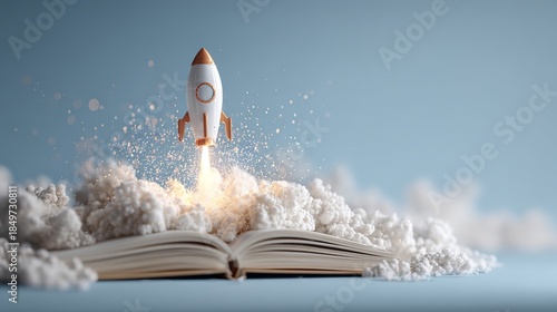Miniature Rocket Launching from Open Book with Smoke and Clouds