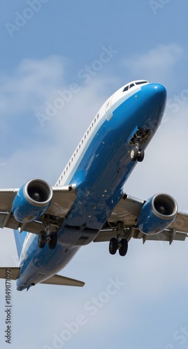 Blue Airplane Taking Off Against a Bright Blue Sky