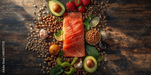 Omega3-rich healthy foods arranged for layout background, focusing on beneficial fats in diet