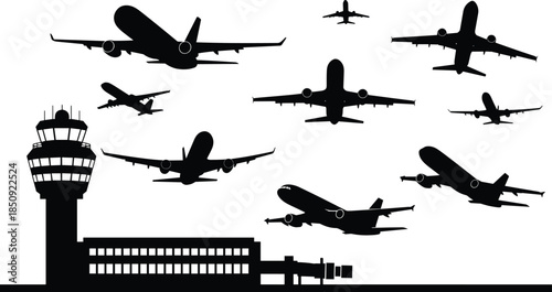Airport, control, tower, and, multiple, airplane, silhouettes, flying, over, runway, aviation, traffic, concept, travel, transportation, flight, departure, arrival, air, traffic, management,