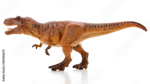 replica. T-Rex figurine isolated on white with dramatic lighting, showcasing detailed textures and fierce presence. wildlife magazines, conservation campaigns, designed for eco-tourism storytelling.