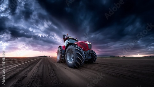 Roter Traktor fährt dynamisch über Feld bei dramatischem Sonnenuntergang