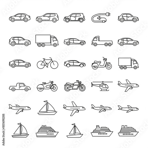 Collection of various vehicles icons including cars trucks bicycles motorcycles and airplanes in line art style