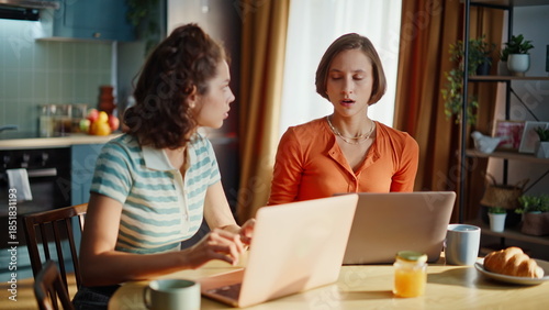 Stressed partners finish call frustrated bad news in kitchen closeup. Two women