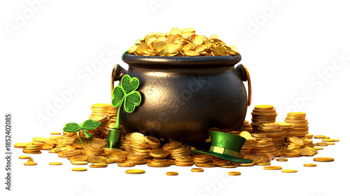 Abundant pot of gold coins overflow with shamrock and leprechaun hat symbols, perfect for St. Patricks Day celebrations and financial prosperity themes.
