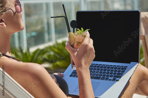 Kobieta pracująca na laptopie. Dziewczyna na wakacjach. Praca w podróży. Praca zdalna. Na basenie.