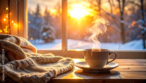 冬の窓辺の安らぎ:朝日に輝く雪景色と温かい飲み物。心地よい室内のライフスタイル背景素材