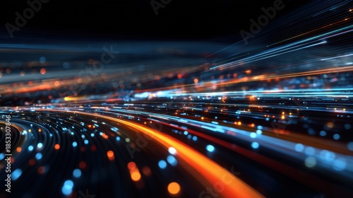 A colorful, abstract image of a cityscape with bright lights and lines. Scene is energetic and dynamic, with the lines and colors creating a sense of movement and excitement