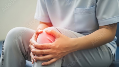Closeup of a person in scrubs clutching a painful knee with red highlight
