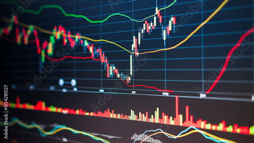 Close-up view of dynamic financial market data displayed on a digital screen, showing candlestick charts and trend lines for investment analysis and trading decisions.