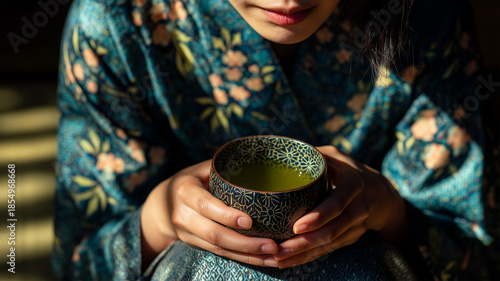 女性が花柄の衣のまま庭で緑茶を包み込み安らぎを感じる午後