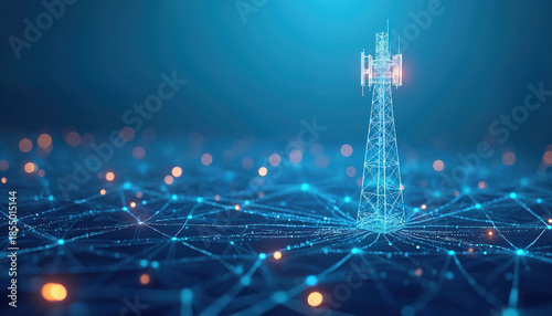Digital telecommunication tower connects global network lines. Data transmission visualized with glowing points and lines, representing internet expansion and connectivity.