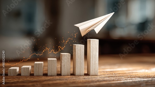 A paper airplane rising above a wooden bar graph symbolizes rapid progress, innovation, and creative business growth.