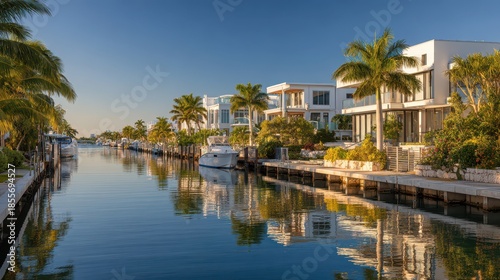 Calm canal view with palm-lined homes and luxury residences in a coastal neighborhood