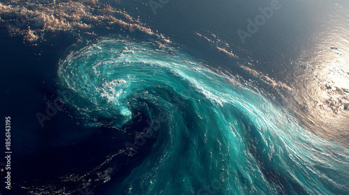Ocean current eddies visible in satellite imagery, swirling water patterns, dynamic marine processes, natural oceanographic features, large-scale currents in open sea, sunlight highlighting texture