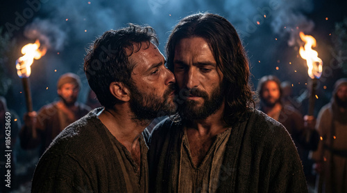 The Kiss of Judas Iscariot betraying Jesus Christ in the Garden of Gethsemane. Biblical scene of betrayal with soldiers holding torches at night. Dramatic Passion of Christ illustration.