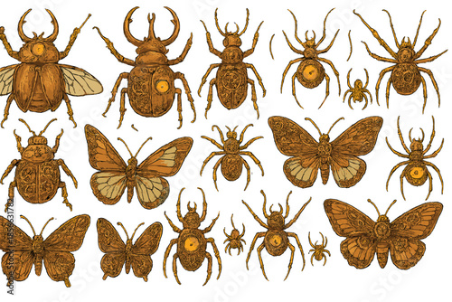 Insects and arthropods drawn in a detailed style showcasing various species and their unique features on a plain background
